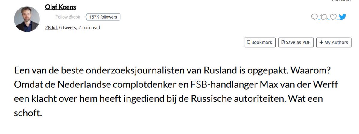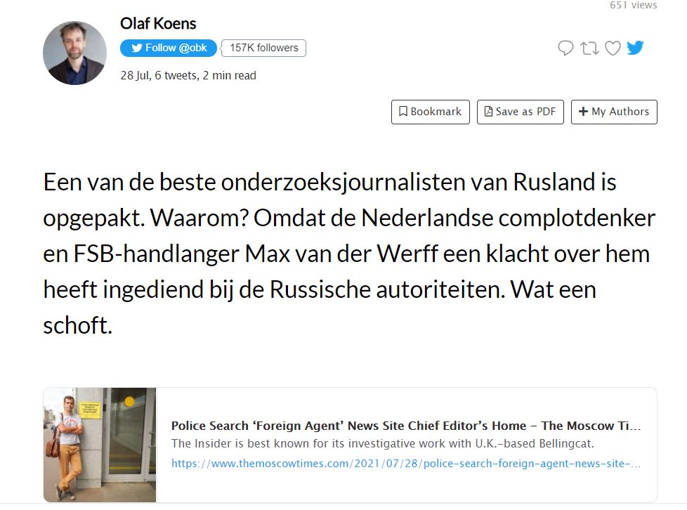 Vandaag maar liefst drie artikelen. (1) "The Insider heeft geen contact met mij opgenomen en heeft gisteren de leugen herhaald waarvoor ik een rechtszaak heb aangespannen tegen Dobrokhotov", zegt Max van der Werff tegen RIA Novosti. ria.ru/20210930/dobro…