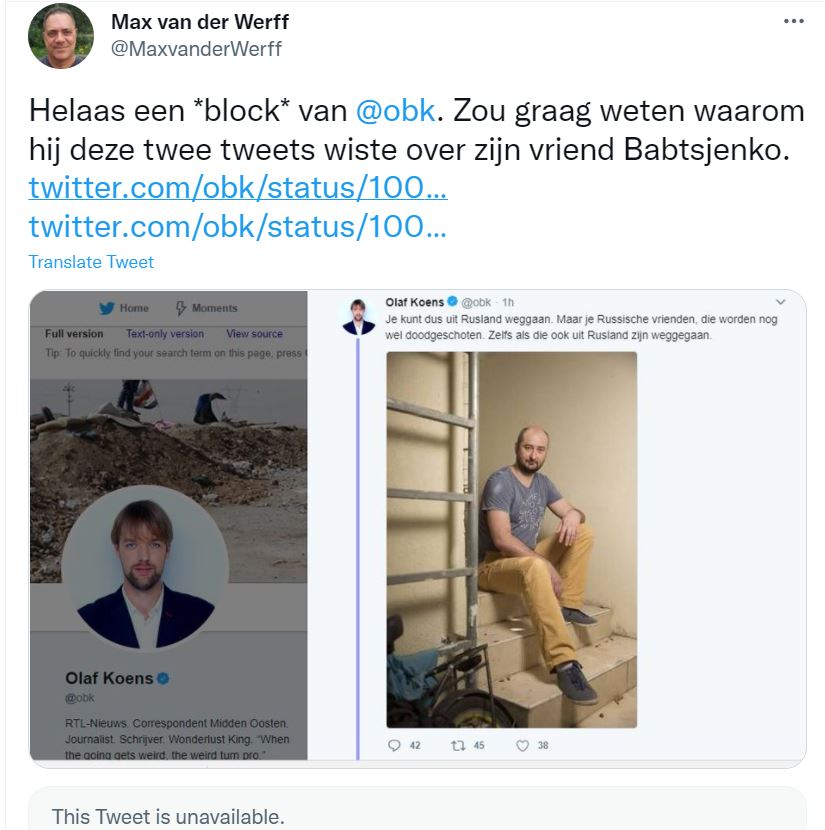 Koens nam het eerder al op voor een andere held van hem. Niemand minder dan collega journalist Arkady Babchenko die door de beulen van Poetin op beestachtige wijze werd vermoord.