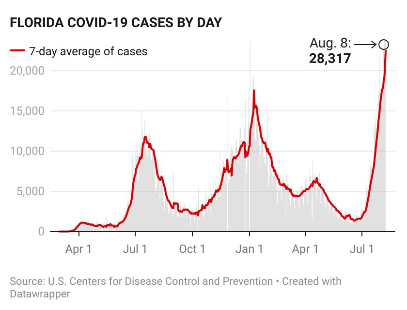 Florida recorded another record breaking day of 28,317 new Covid cases reported. New cases are literally off the chart while schools start this week.