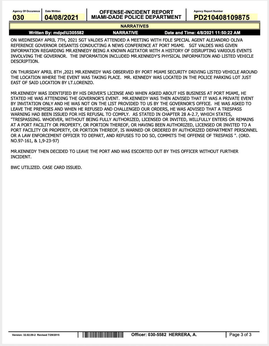 Here is a video of my unlawful detention and trespass by @MiamiPD from a public space for no reason whatsoever. Documents we obtained later revealed the Florida Department of Law Enforcement is surveilling me and sharing my personal and vehicle information to police agencies.