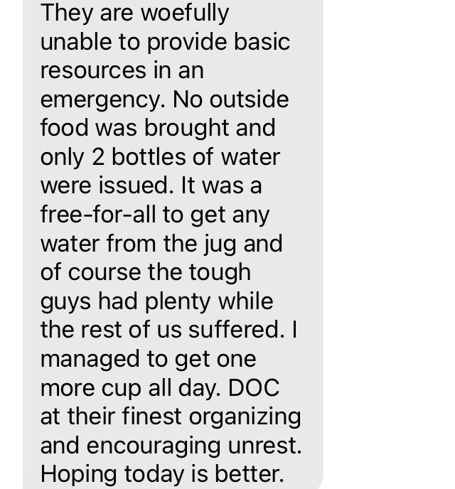 Still no update from DOC as to what happened but I'm getting reports from prisoners and families that the water is back on this morning - so that was 24 hours without running water for more than 5,000 incarcerated people - this is a regular occurrence in our prisons