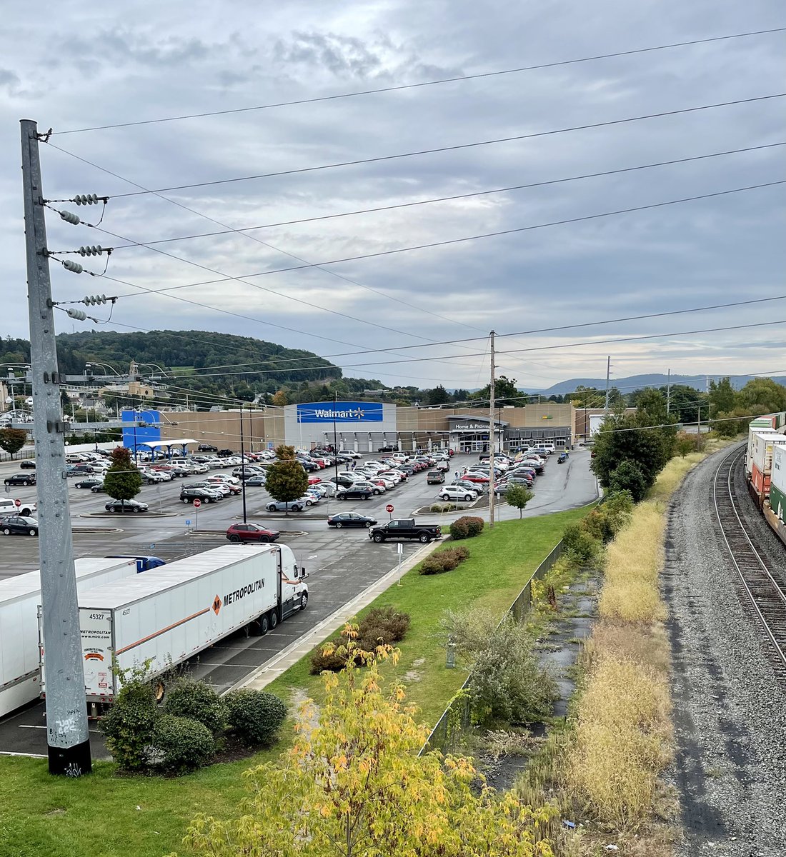 Chock full Walmart on one side of bridge, abandoned factory on other
