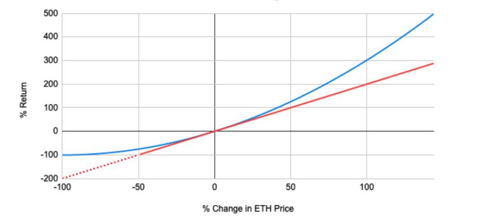 Squeeth is a perpetual instrument that gives holders a payoff of ETH². This creates a leveraged position with unlimited upside, and protected downside. Compared to a 2x leveraged position, buyers make more when ETH goes up and lose less when ETH goes down.