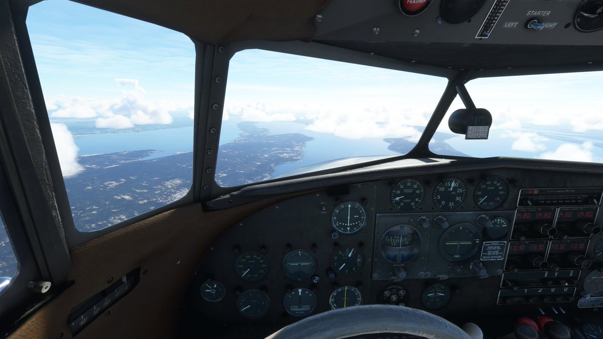 Flying over Whidbey Island Naval Air Station, in the Puget Sound, at about 7,500 feet, traveling at a cruising speed of 170 knots.