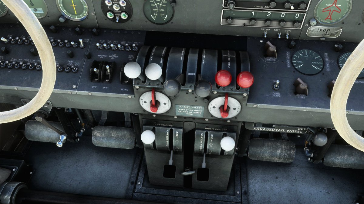 Between the pilot and co-pilot are the main power controls for both engines: (white) propeller RPM, (black) throttle, and (red) fuel mixture, as well as (red and white) fuel cut-off dials for both.
