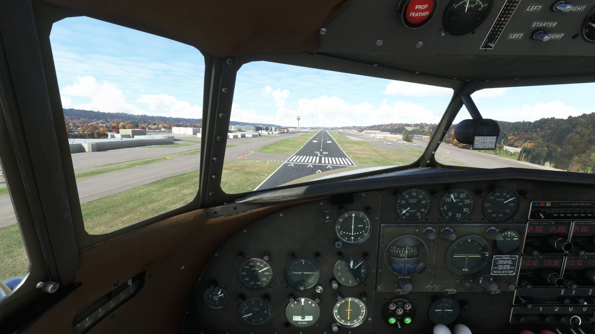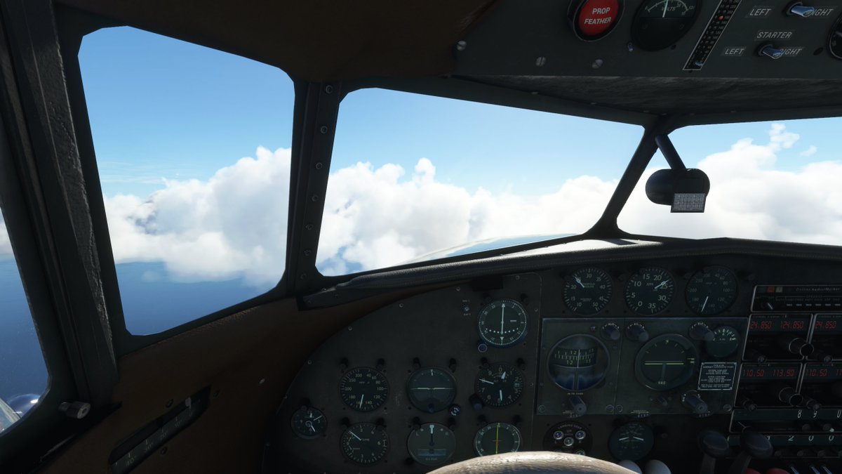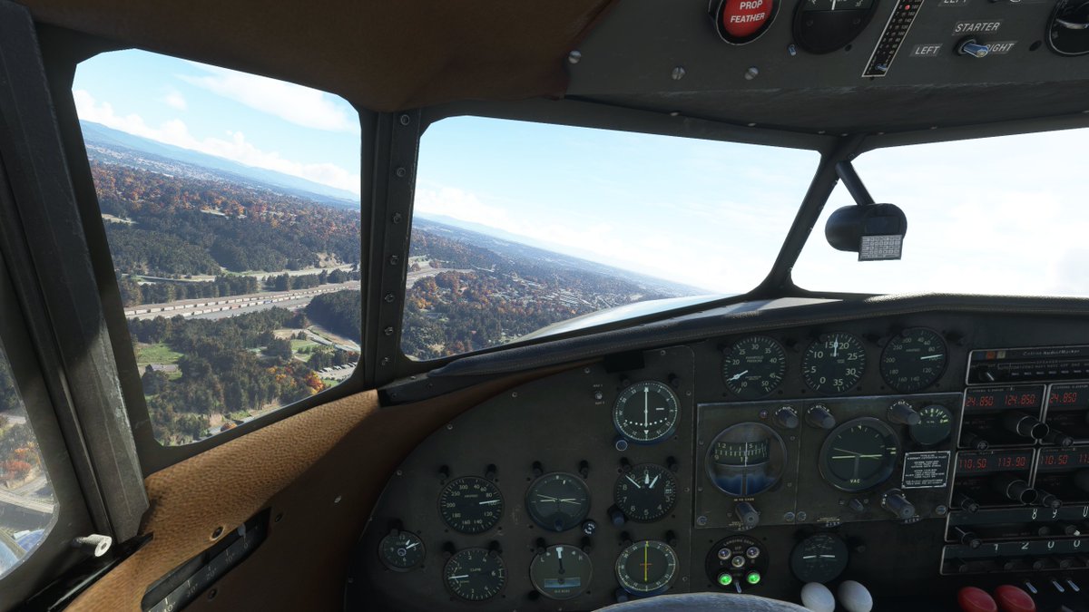 These two screenshots show the adjustable pitch propeller in action, from fine (for takeoff and landing, left) to fully feathered (in case of a disabled engine, right).
