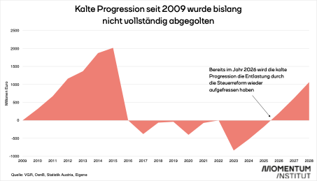 Rechnet man bis 2009 zurück, wurde die kalte Progression der letzten 12 Jahre damit immer noch nicht vollständig abgegolten. Auch der Effekt der jetzigen Tarifsenkung wird bereits im Jahr 2026 wieder verpufft sein.