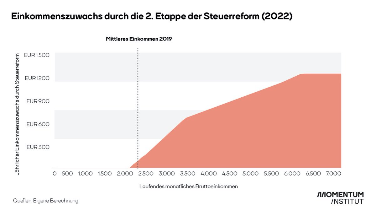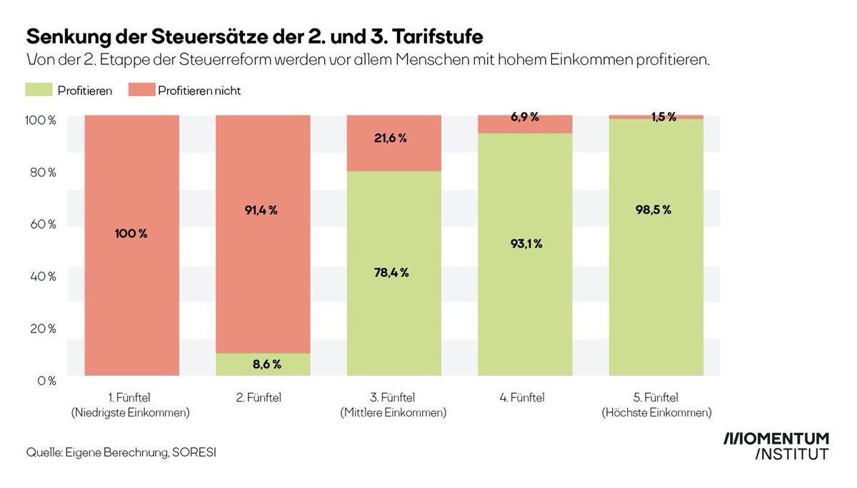 Die Anpassung der 1. und 2. Tarifstufe kommt von den unteren Einkommensfünfteln bis hin zu den Bestverdiener:innen allen zugute. Von der Erhöhung der 3. und 4. Stufe profitieren tendentziell Besserverdiener:innen. Von der 4. Stufe sogar lediglich die einkommensstärksten 20%. 2/