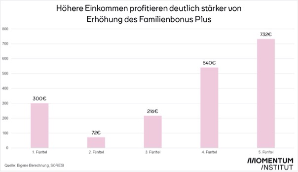 FAMILIENBONUS: Nutzt vor allem höheren Einkommen. In den beiden untersten Einkommensfünfteln kommt so gut wie gar nichts an. Außerdem: problematische Incentives zwischen Männern und Frauen. Erhöhung der Familienbeihilfe wäre bessere Alternative gewesen.