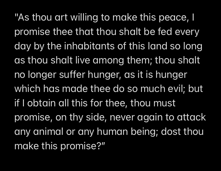 The wolf lived in the town for the next two years until he died of old age, going door to door for food. When he died, the townspeople “mourned his loss greatly.”