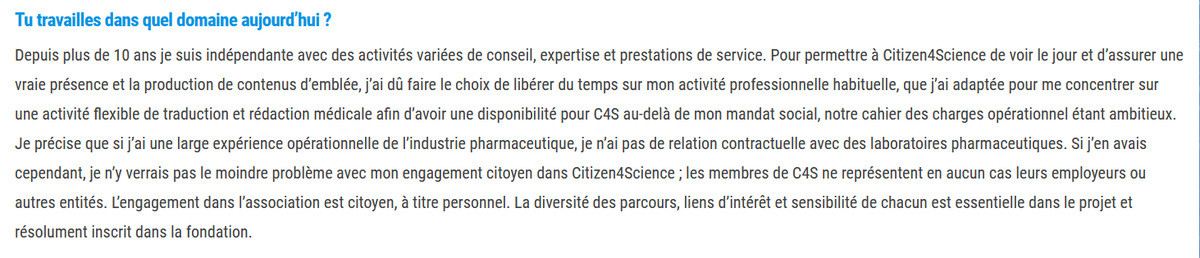 4/n Fabienne Blum alias @zenutopia, fondatrice de ce pseudo mouvement citoyen, et qui continue à faire du travail de rédaction et de traduction pour l'industrie pharma résume ici sa philosophie citizen4science.org/mini-qa-fabien…