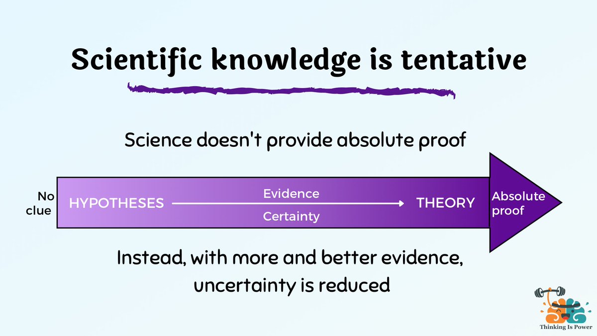 3. Scientific conclusions are always tentative: Scientific knowledge is subject to revision, and we NEVER reach 100% certainty or proof! The better the evidence the more reliable the conclusion.... but we always leave ourselves open to changing our minds with new evidence.