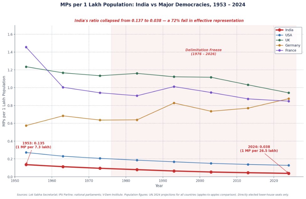 In 1953, India's ratio stood at 0.137 MPs per lakh, comparable to the USA and within the band of other functioning democracies.