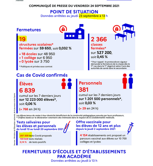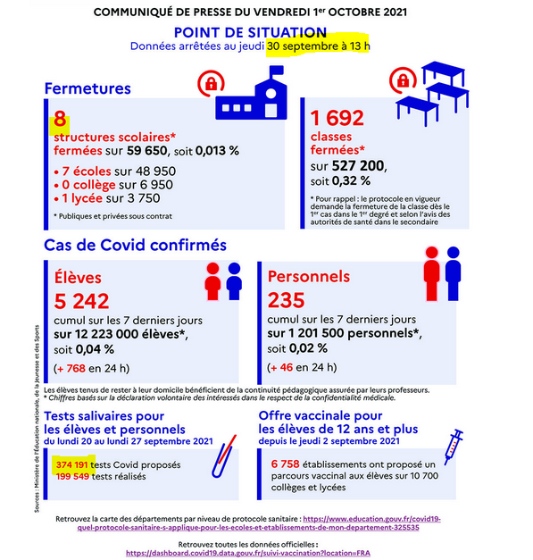 5/n Le nombre de classes et établissements fermés, d'élèves et enseignants infectés, continue à diminuer de semaine en semaine. Mais ça ne les empêche pas de dire que tout va de mal en pis dans les écoles.