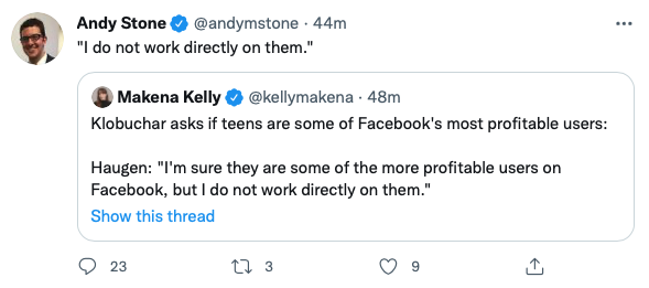 It's worth noting facebook employees seem to be silent on Twitter during the hearing except for their lapdog spokesperson who wants you to know that the fact the witness didn't work directly on an issue, he thinks it undermines the evidence and her knowledge of this issue. /8
