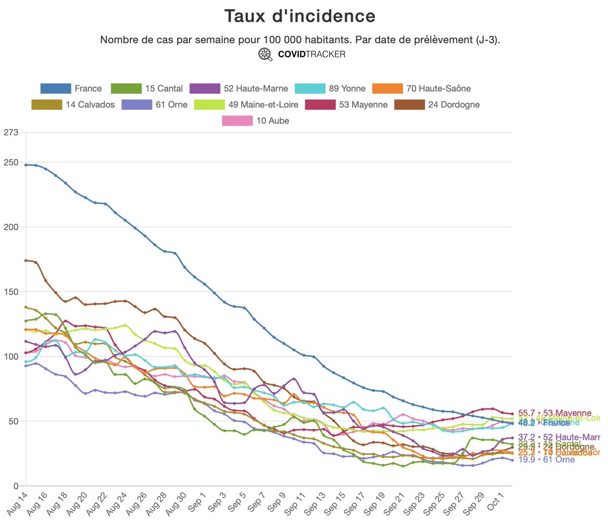 Il faut garder un œil sur les départements 10, 24, 49, 52, 53 89, pour voir comment évolue cette (faible) hausse.