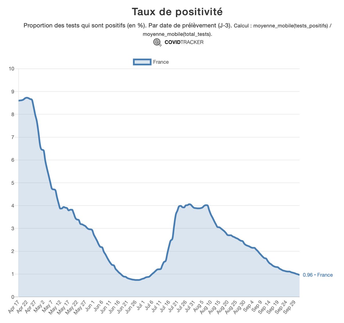 Le taux de positivité continue de baisser légèrement, il est de 0,96%
