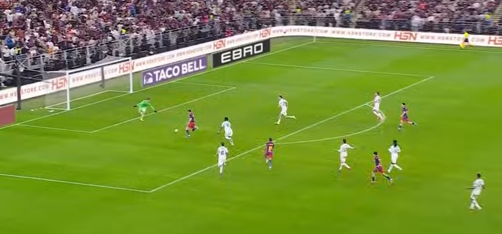 Mi interpretación es que hubiera sido mejor que no se produciera el salto de Araujo ya que los compañeros cercanos (Mingueza + Piqué) tenían marca (Carrasco + LS) y no podían compensar