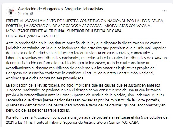 Hoy a las 11 los abogados laboralistas convocan a protestar contra la Legislatura porteña que empoderó al TSJ de CABA como tercera instancia judicial para intervenir en la justicia del Trabajo y el fuero Comercial donde hiberna la quiebra del Correo de los Macri hace 20 años.👇👇