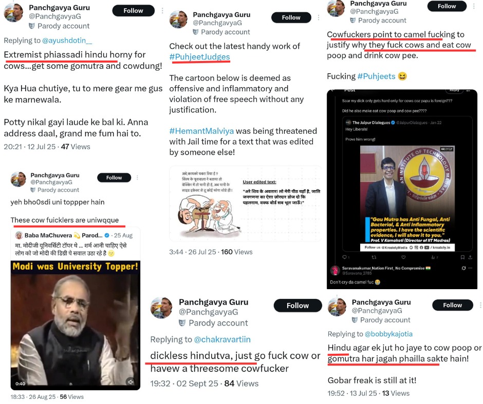 3. Now read these tweets. Tweets are full of hate against Hindus. Words like ‘Extremist Phiassadi Hindu’, ‘Cowfucker’, ‘Dickless Hindutva’, ‘Go fuck cow’, and Jibes on Guamutra and Gobar like terrorists are being used!