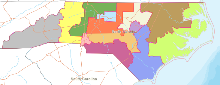 Wake, Mecklenburg and Guilford counties would all be split up into 3 districts in his map. Notably, Greensboro would be combined with a bunch of rural areas in the northwest part of the state, instead of combined with Winston-Salem like it currently is. #ncpol#ncga