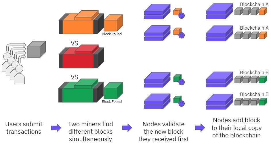 This temporarily creates two versions of the blockchain (A & B).