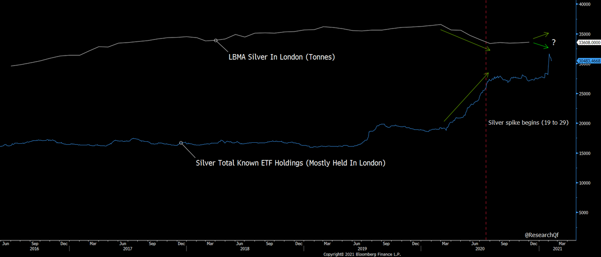 As best as I can tell, his 28K tonne of ETF silver in London is less than total ETF holdings mostly because 1/7 SLV vaults is in NY and $PSLV is in Canada.