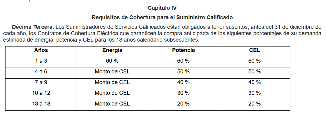 Con el fin de tener precios estables a largo plazo en México, la CRE establece un porcentaje de electricidad que todos los suministradores deberán tener pre comprados para los próximos 18 años. Para el suministro básico los primeros 3 años son el 100%.