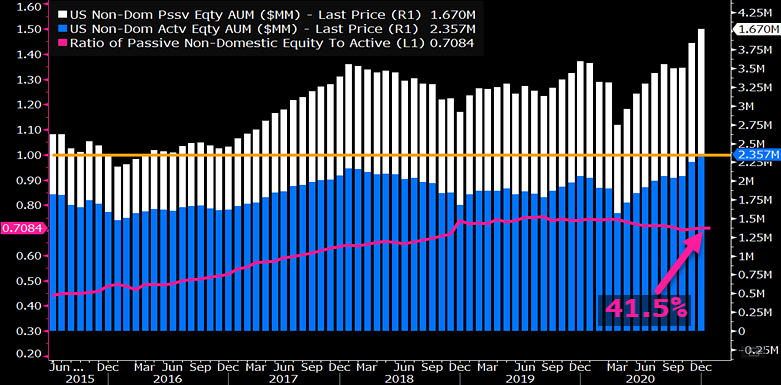 What i'm calling "Non-Domestic" sits around 41.5%. and puts the aggregate equity fund market at about 50.3% passive. But if international equities start offering relative positive performance to domestic, I expect that % to increase as well.