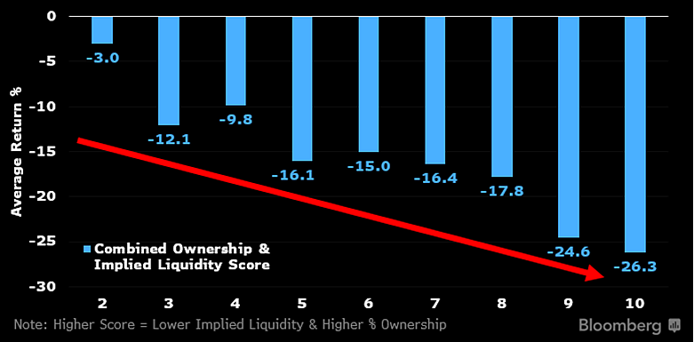 Regression analysis showed nothing in most basic metrics like beta, market cap, liquidity, etc. But taking the firm's stakes in the underlying stocks and their liquidity relative to the size of its position showed a definitive pattern. Heres avg return by quintile in each metric.