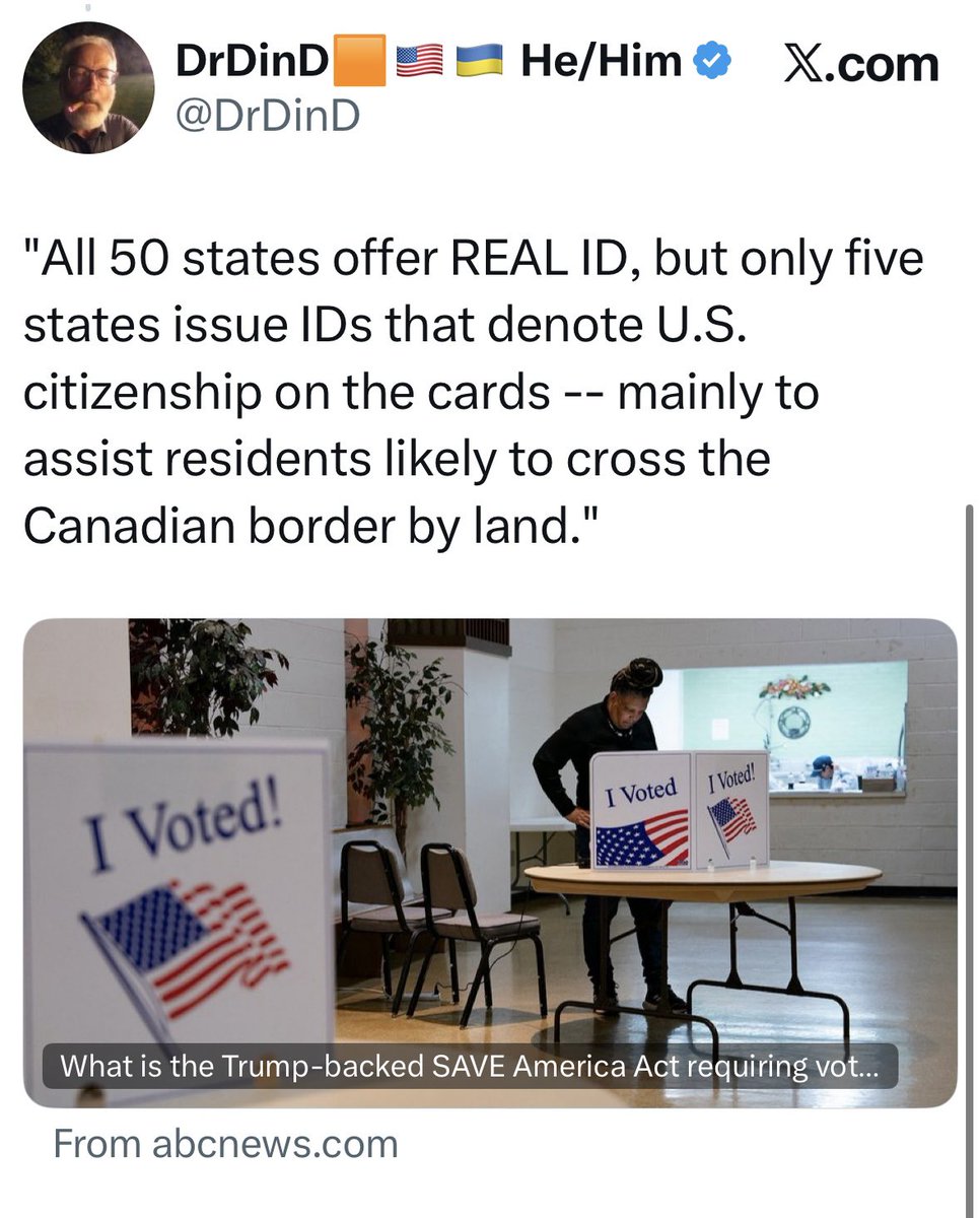 Most Real IDs do *not* prove citizenship. (EDLs, which are available in only 5 states are an exception) The GOP’s “SAVE” Act thus misleads when it says voters can prove citizenship w/ “ID issued consistent w/ the reqmts of…REAL ID…that indicates the applicant is a citizen…” 1/