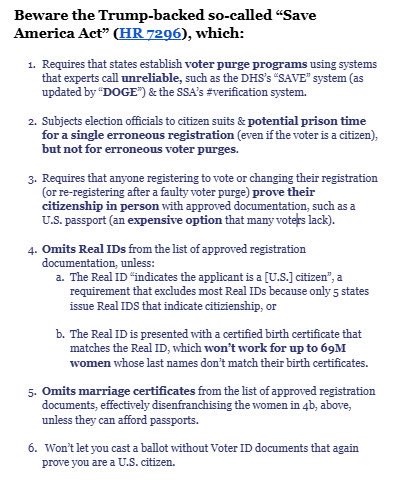 I read the Trump-backed voter suppression bill, the so-called “Save America Act,” so you don’t have to. Here’s my summary. Please tell your Senators to vote NO on this abomination: 202-224-3121. TY. 1/
