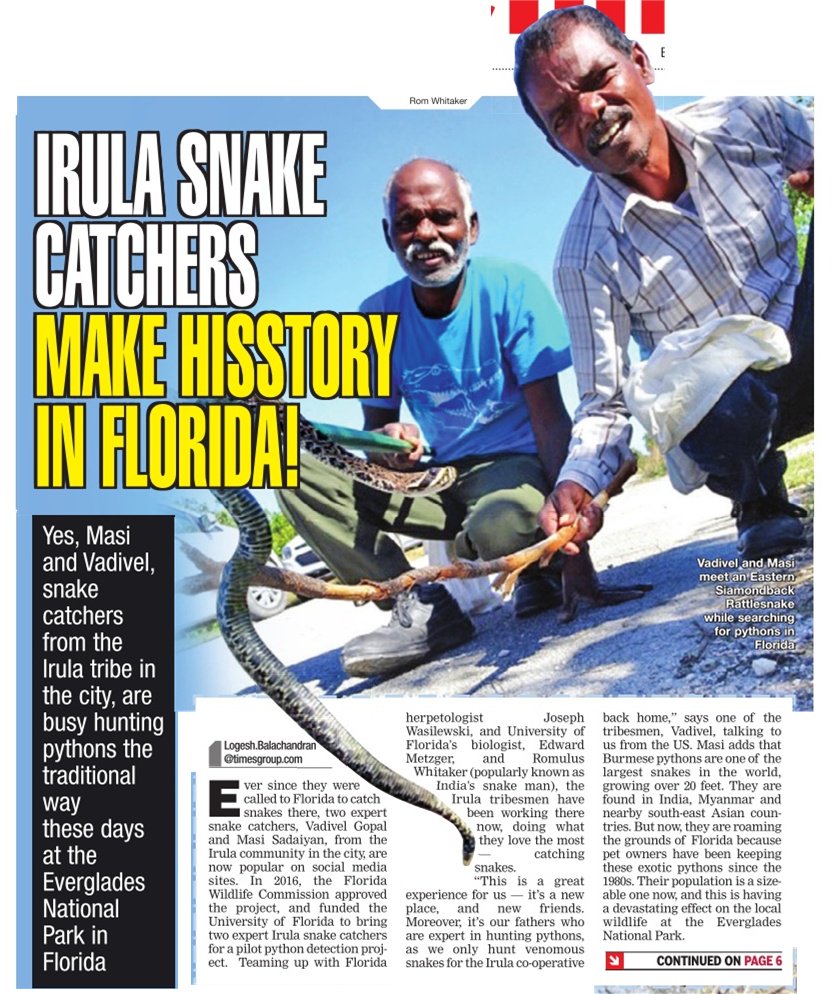 Irula tribe members in Florida, USA helping National Park authorities to catch pythons for conservation & breeding.