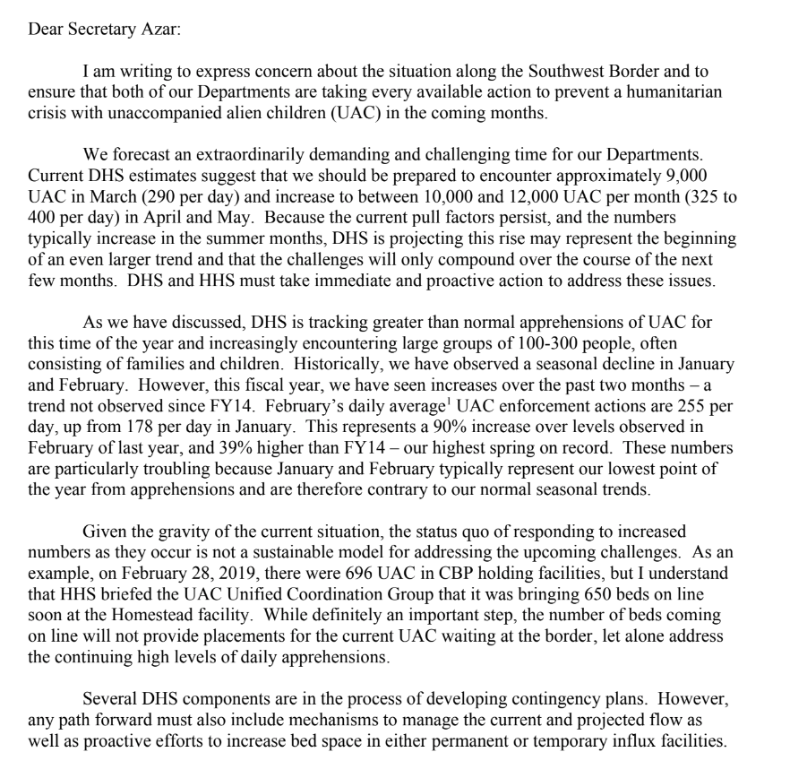 In a Feb. 2019 email, Trump DHS Secretary Kirstjen Nielsen told Trump HHS Sec. Alex Azar that DHS forecasted “an extraordinarily demanding and challenging time for our Departments” due to increasing numbers of unaccompanied migrant children in government custody.