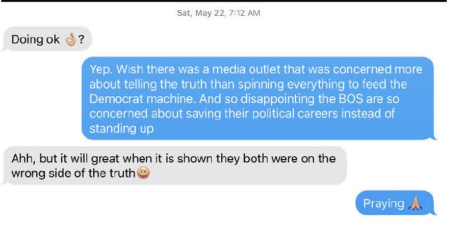 After Fann sent a text lamenting the lack of support for the “audit” in the media and from the Maricopa County Board of Supervisors, Leach texted, “Ahh, but it will be great when it is shown they both were on the wrong side of the truth.” Fann replied, “Praying.”