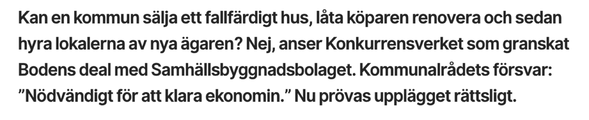 Den här nyheten är två dagar gammal. SBB (fd S politiker) har köpt en fastighet av Bodens kommun (S-styrt), som man renoverat och nu hyr ut till Bodens kommun för en mycket högre slant. Detta gillar inte Konkurrensverket vilket nog oroar marknaden lite.