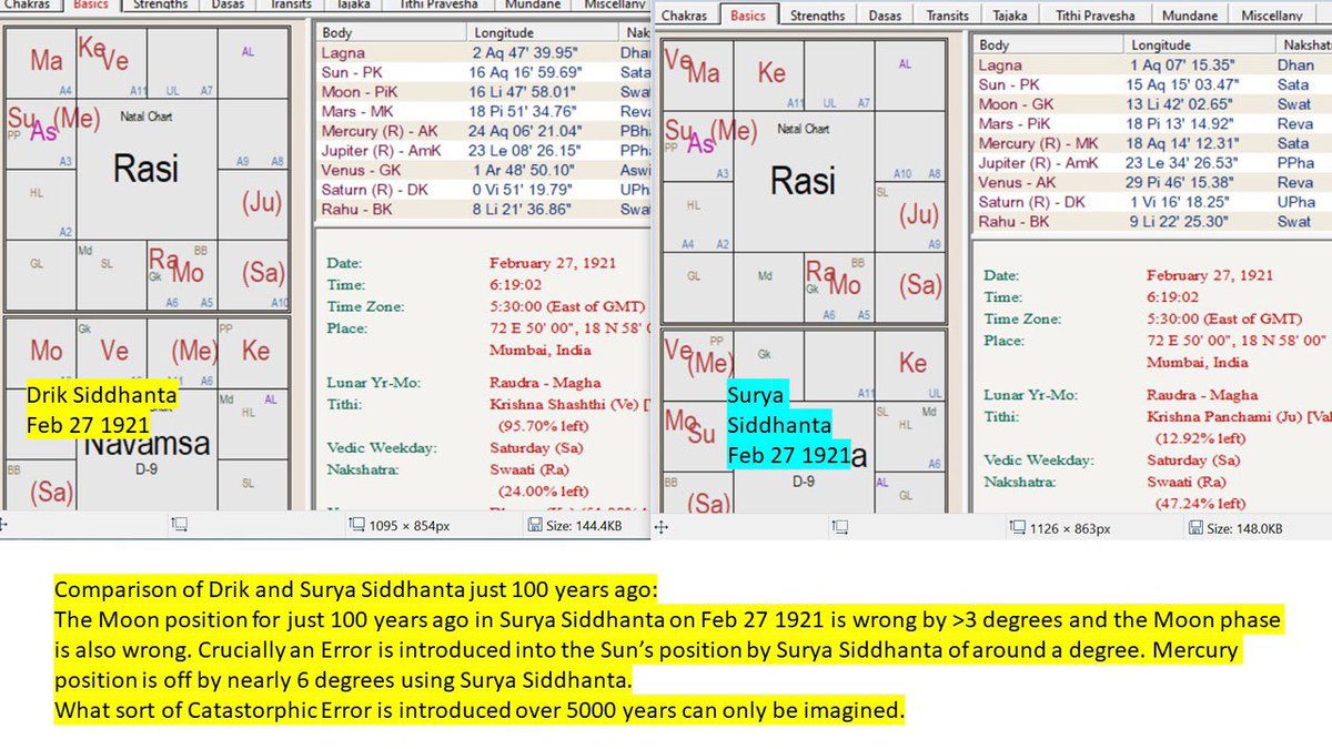 You see an image on the left (Drik) and on the right is Surya Siddhanta for the same time just 100 years ago.