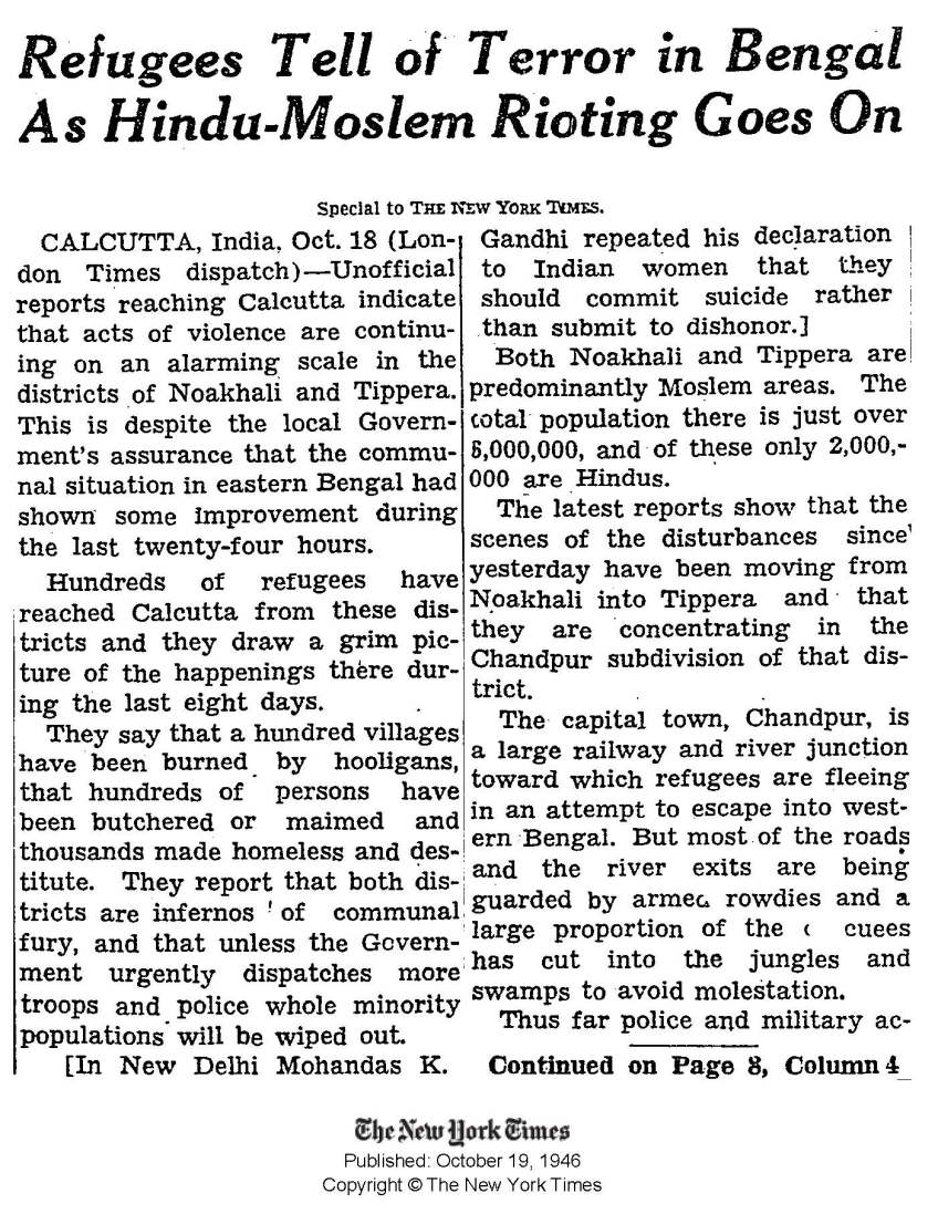 Wrote Miss Muriel Leister,member of a relief committee sent to Noakhali on 6th November, 1946,(V.V. Nagarkar – Genesis – p 446)