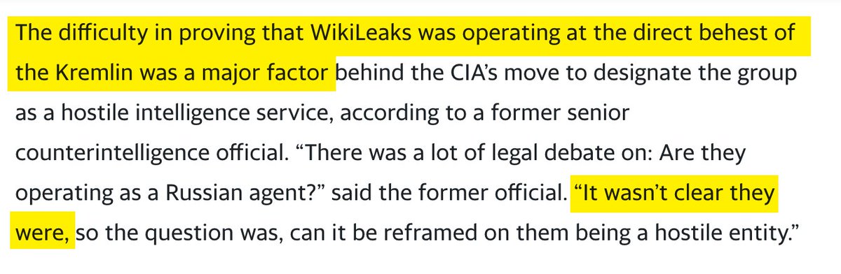 One of the most overlooked revelations in the Yahoo News article about how CIA plotted to kidnap or assassinate Julian Assange was that even the Intel officials who hated Assange most *admitted* they had no evidence he or WikiLeaks were Kremlin agents: