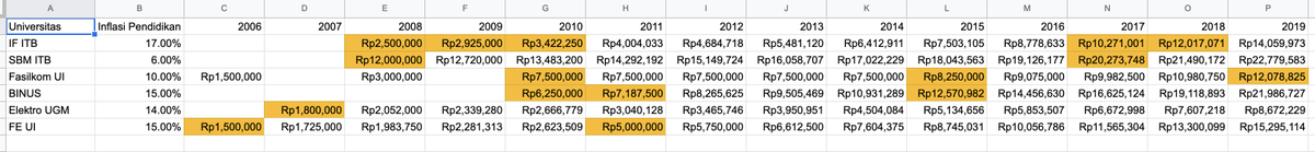 Akhirnya tanya alumni univ dari berbagai angkatan dan beberapa jurusan. Terus dapet deh angka inflasi. Kesimpulannya, ternyata inflasi biaya pendidikan di Indonesia itu rata2 15% per tahun!