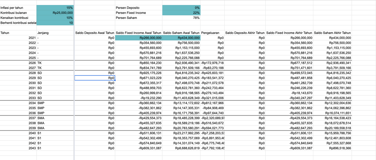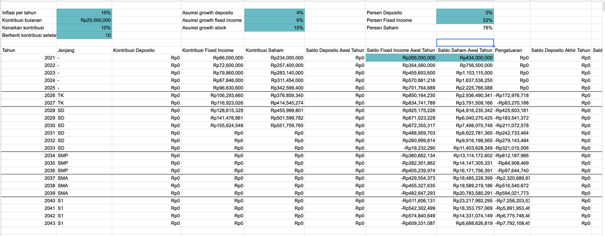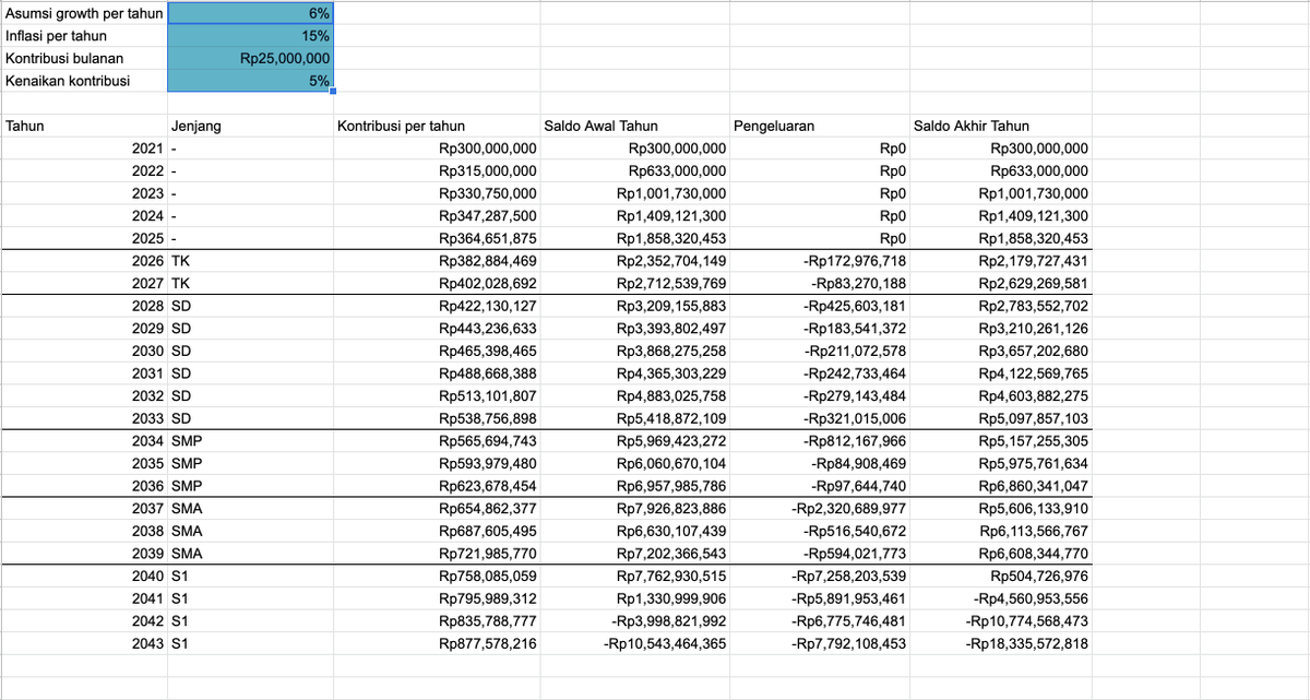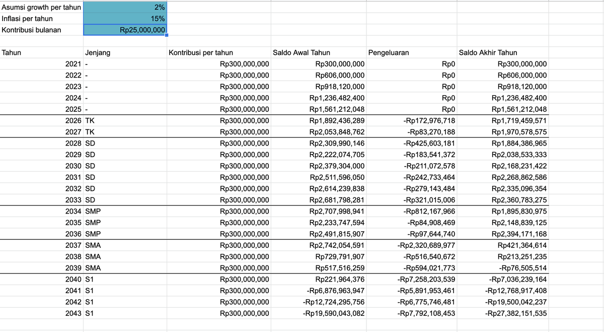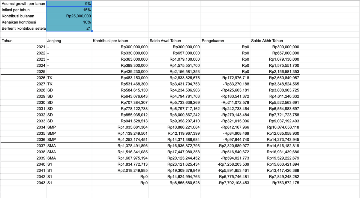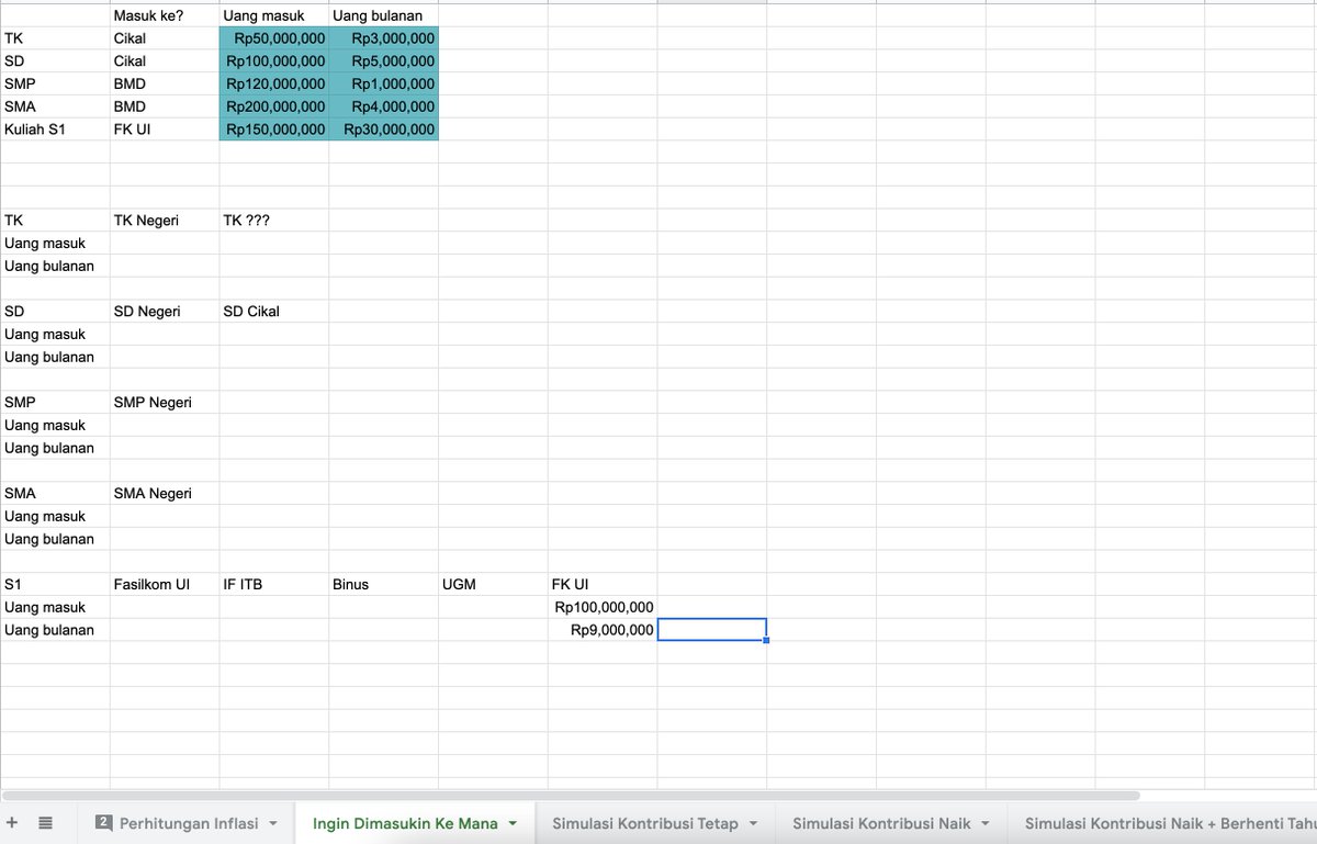 Di Google sheetnya sudah ditandain juga variabel mana yang bisa diganti: 1. Masukin ke sekolah mana 2. Kontribusi per bulan 3. Asumsi growth dari investasi 4. Berhenti kerja abis berapa taun 5. Inflasi pendidikan per tahun (harusnya ga usah ganti)