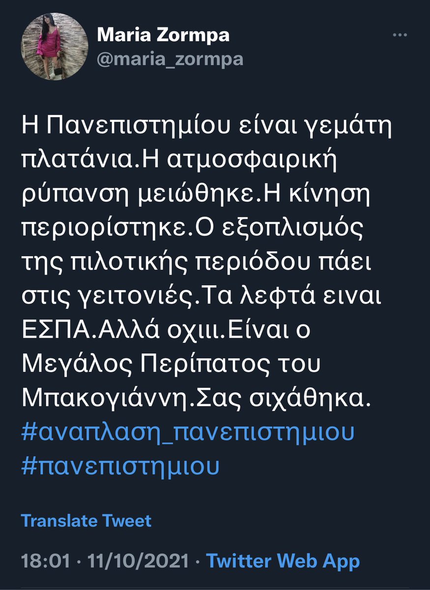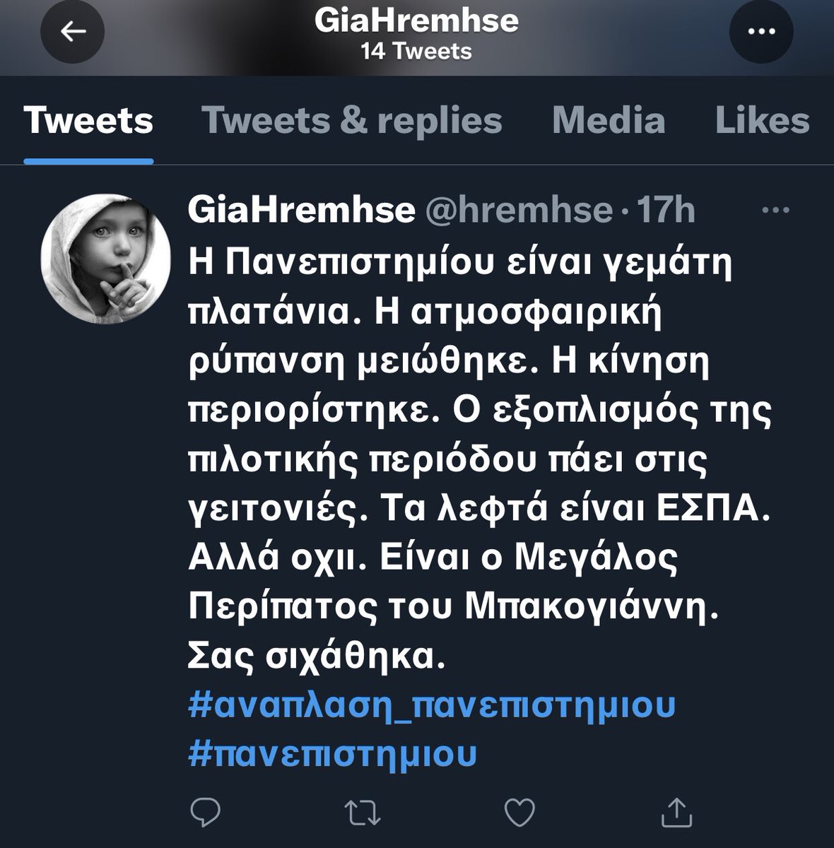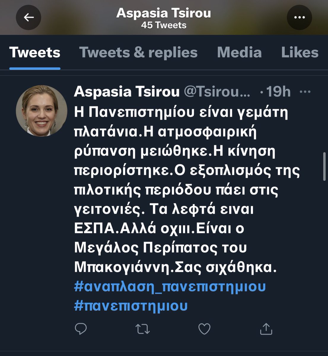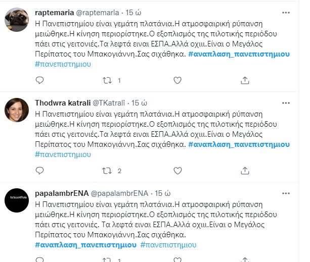 endlessly tweeting the same tweet(s) w/the hashtag #αναπλαση_πανεπιστημιου, whilst otherwise engaging in troll-like anti-opposition (Syriza) propaganda.