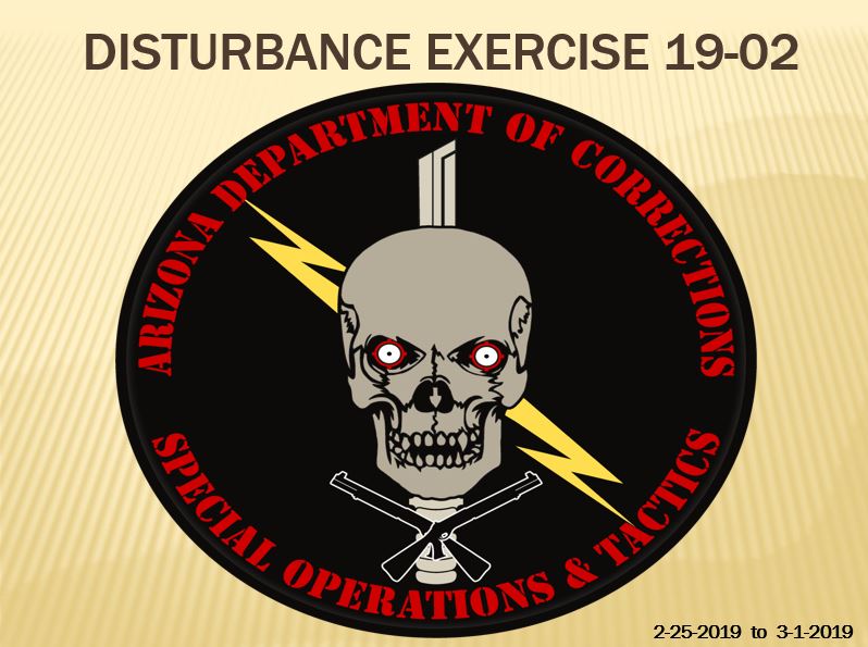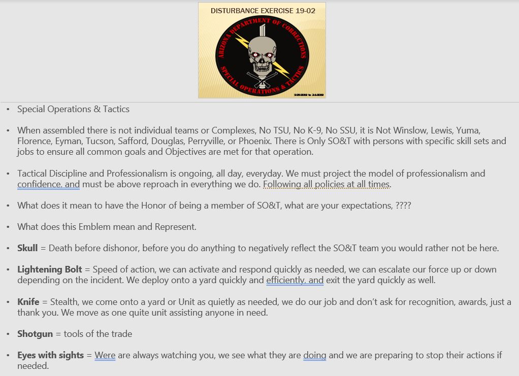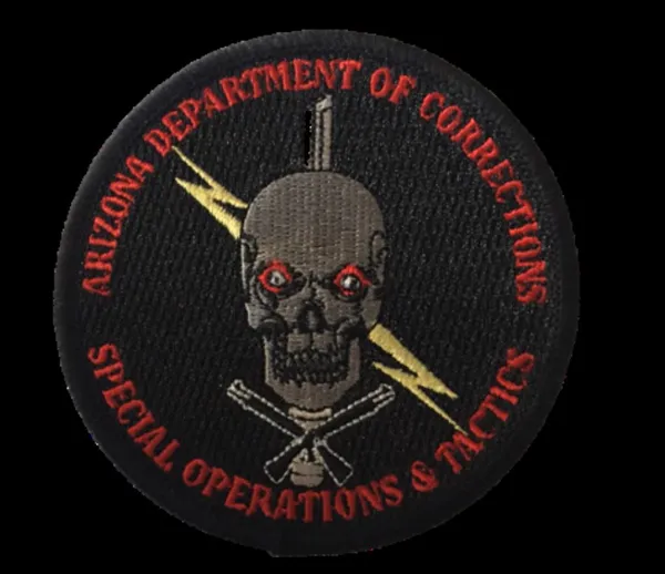 A public Facebook post made by a Commander at the Correctional Officer Training Academy in Arizona shows several Arizona Department of Corrections special operations unit patches featuring a skull and crossed shotguns and a skull with nightsticks