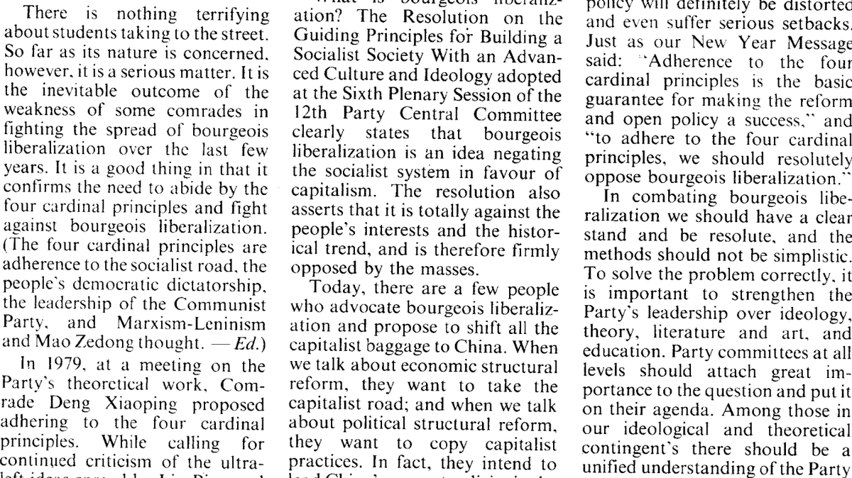 The campaign continued at a low simmer, led by Deng Liqun and crew, often substituting "spiritual pollution" with other terms. When student protests kicked off in the winter of 1986 at campuses across the country, the conservatives warned that their advice was not being heeded.