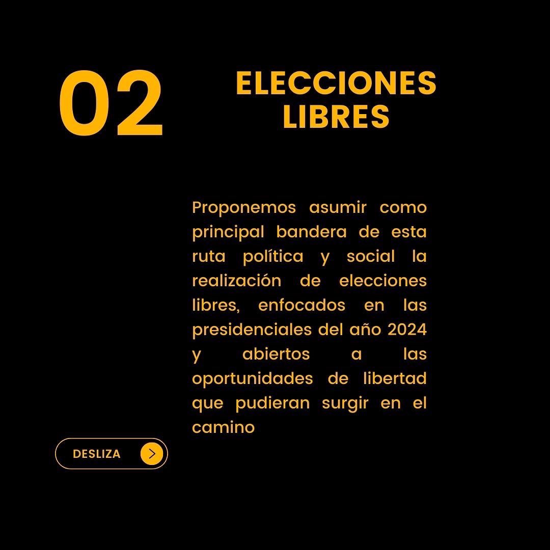 Proponemos asumir como principal bandera de esta ruta política y social la realización de elecciones libres, enfocados en las presidenciales del año 2024 y abiertos a las oportunidades de libertad que pudieran surgir en el camino.