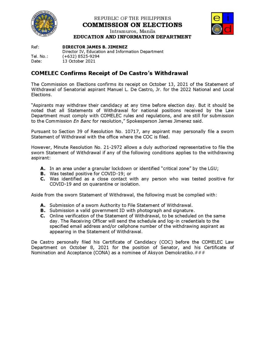 @meltlopez Comelec confirms receiving De Castro's withdrawal from the Senate race on Wednesday, Oct. 13 or 5 days after he filed his candidacy.