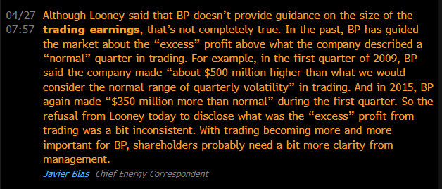 BP CEO Bernard Looney refused to disclose how much money the company made from gas trading in 1Q, other than describing the quarter as "exceptional". In the past, BP provided some numeric guidance of the extra profit from trading, as we wrote on our TOPLive Blog this morning $BP
