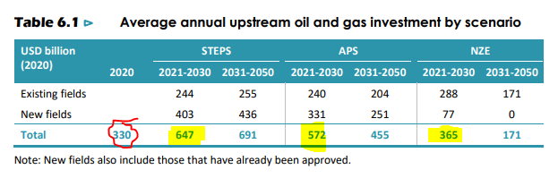 Under IEA middle-ground scenario (APS, which includes current policy and stated net-zero pledges), oil and gas investment needs to increase >70% from $330bn in 2020 to ~$572bn from 2021-2030. That's a scenario in which oil demand has already peaked, and starts to fall 3/6