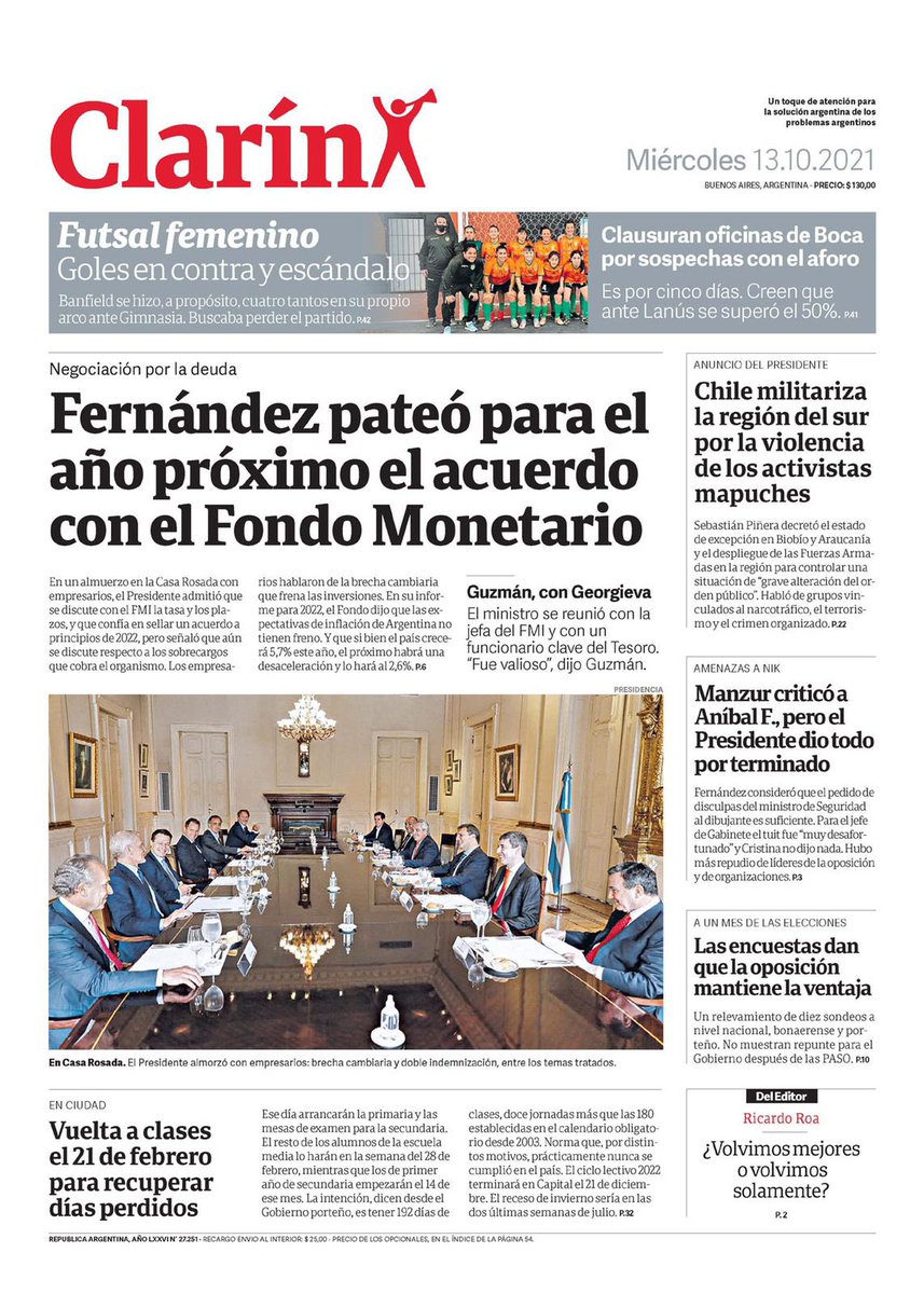 Hoy nos encontramos con la tapa del diario Clarín que dice que, en esa reunión, anuncié que el acuerdo con el FMI se sellaría el año próximo. No fue así. Queremos lograr ese acuerdo tan pronto como se den las condiciones.