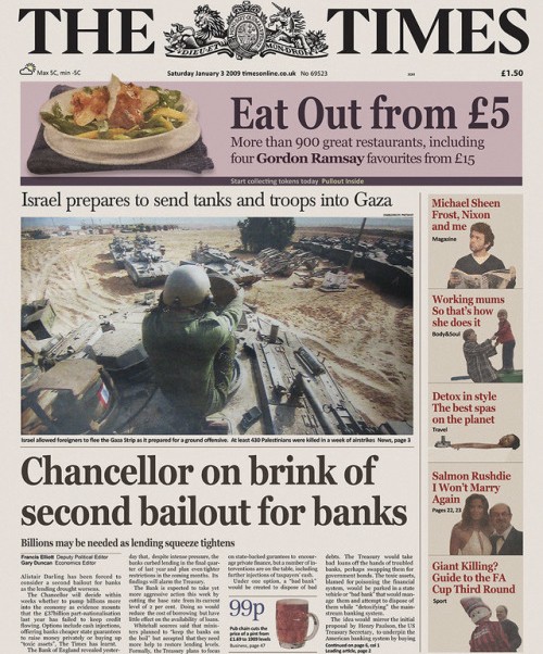 Right there in the code is a message worth pondering: “The Times / 03 Jan / 2009 Chancellor on brink of second bailout of banks.”